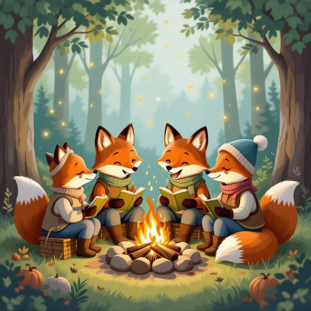 This image shows felted foxes in a forest clearing around a campfire. The picture is reminiscent of classic children's book illustrations with warm, earthy tones and soft textures.