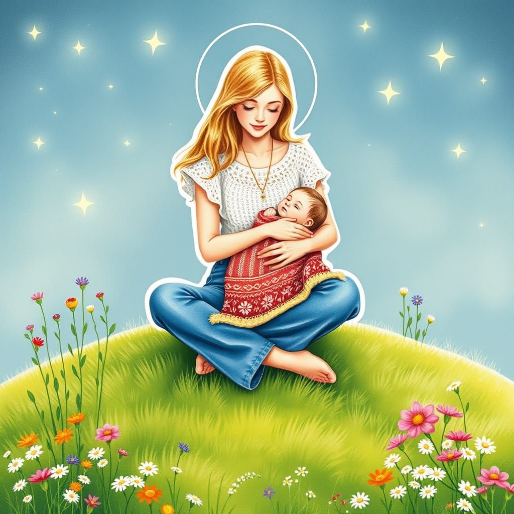 This image depicts a serene mother and baby in a lush, emerald green meadow surrounded by colorful wildflowers and twinkling stars, in a vintage, bohemian-inspired style reminiscent of Beatrix Potter's watercolor illustrations.