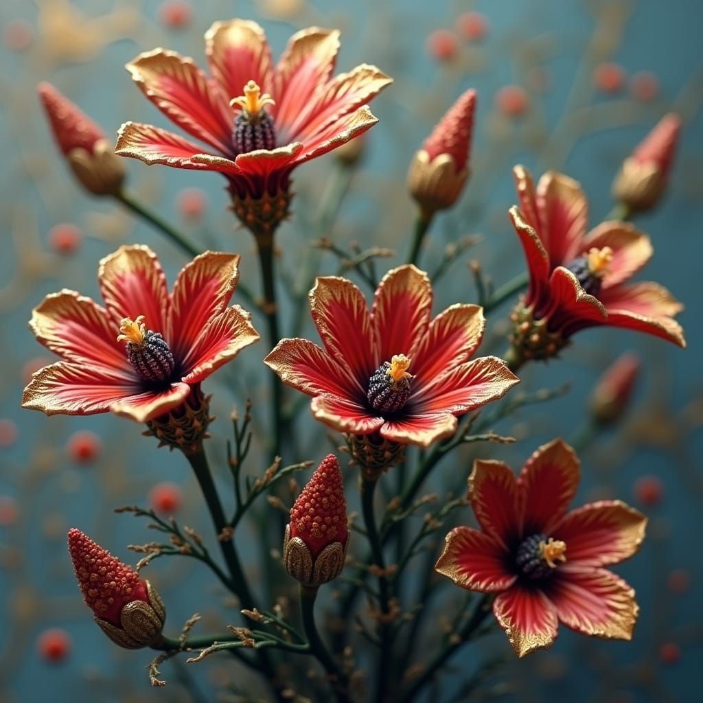 This image shows a maximalist fractal design in red, gold and silver. The artwork features fine, realistic details reminiscent of filigree and spray paint techniques.