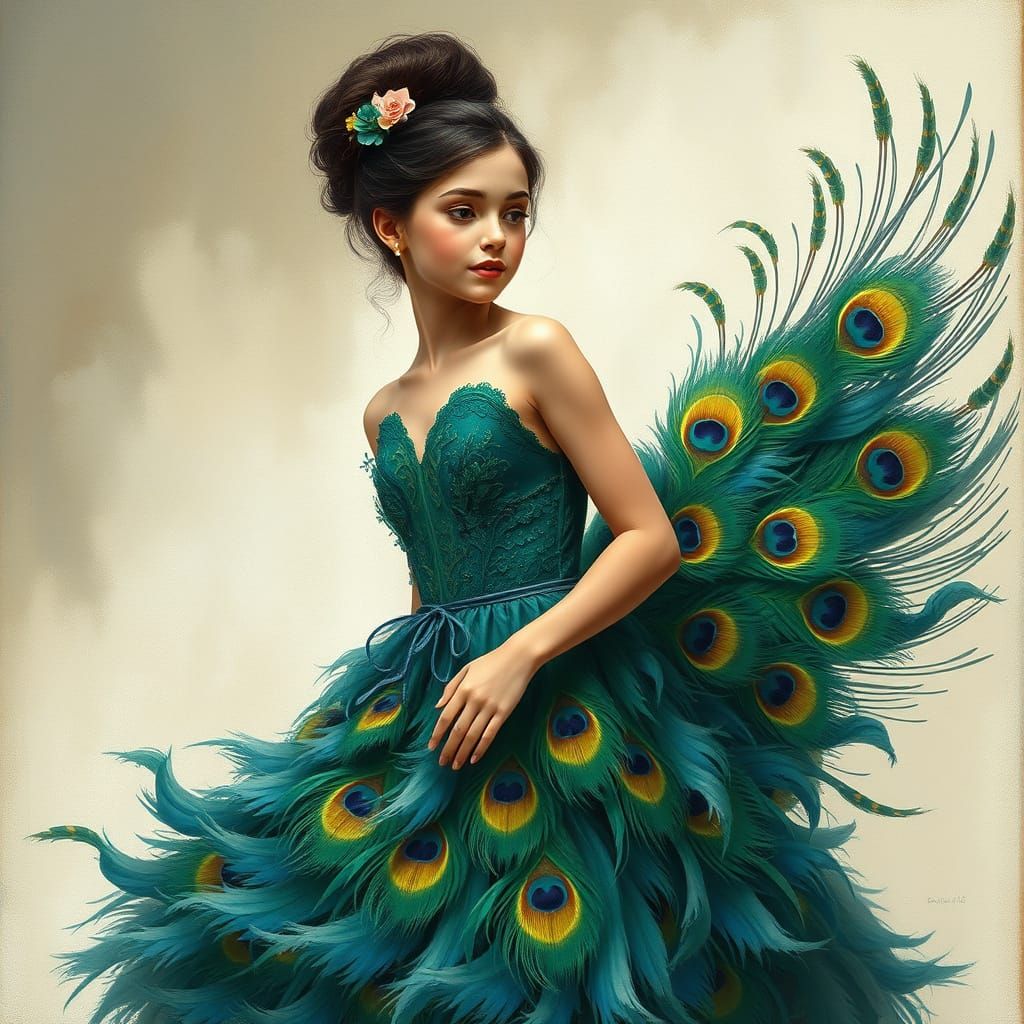 This image showcases a young woman adorned in a striking dress made of peacock feathers. The artwork captures a sophisticated and graceful presence.