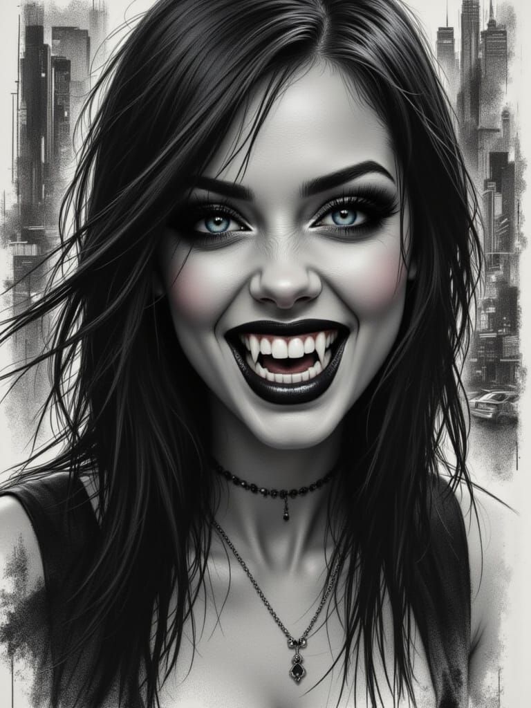 This image shows a cyberpunk vampire woman with fangs in downtown Tokyo, captured in a charcoal sketch style reminiscent of Prudhon and Degas' works, with a gothic punk aesthetic and a sense of movement and flux