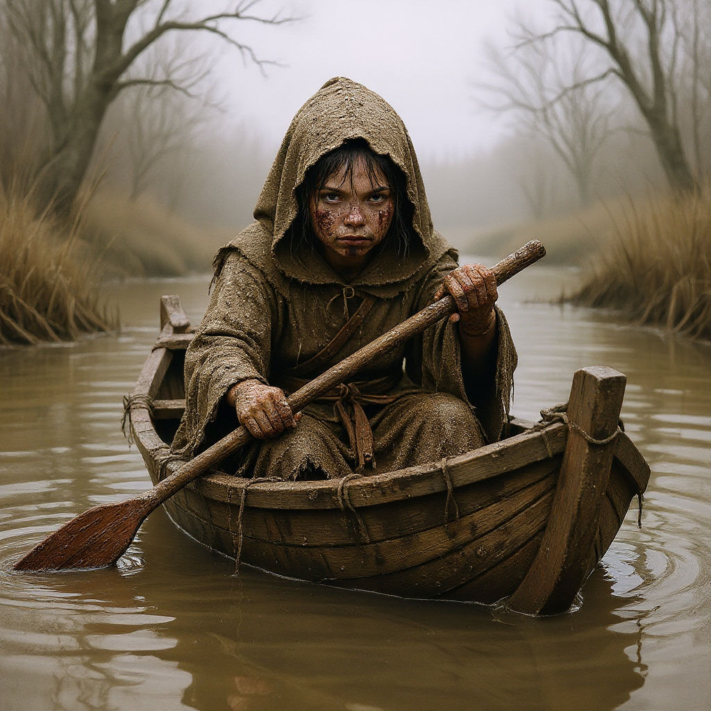 A grimy, mud-caked child, gender ambiguous and of indeterminate species, paddles a small boat. This image captures the essence of medieval childhood in a gritty, realistic style.