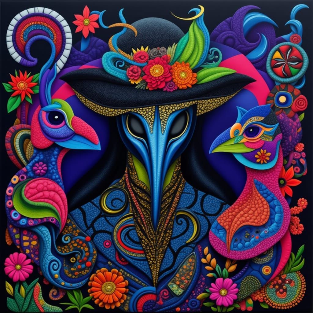 Create your own dark and whimsical quilt-patterned plague doctor images with our free AI image generator!