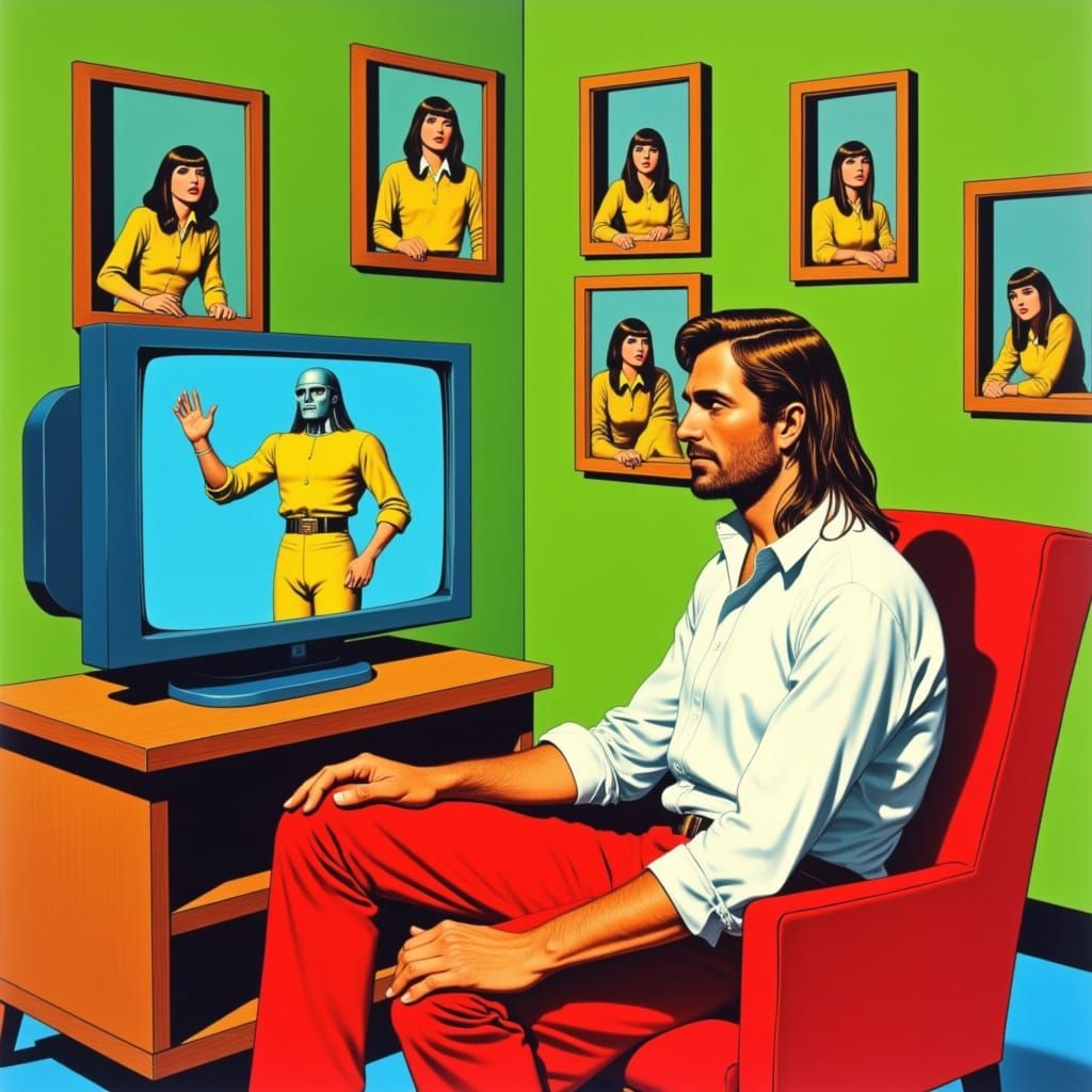 This vibrant image depicts a man in a medieval-inspired setting, surrounded by modern elements. He sits in a bold red chair, wearing a white shirt and red pants, with long, wavy hair resembling wires. A TV on a wooden stand displays a robot-like figure in a yellow jumpsuit, adding a futuristic touch. The...