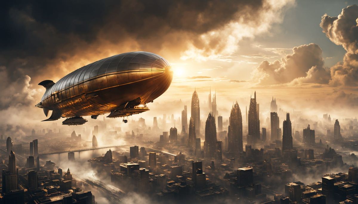 A breathtaking science fiction illustration of an airship gracefully navigating above a modern city. The dynamic shot captures golden light piercing through mist, with dark, saturated colors and high contrast cinematic lighting.