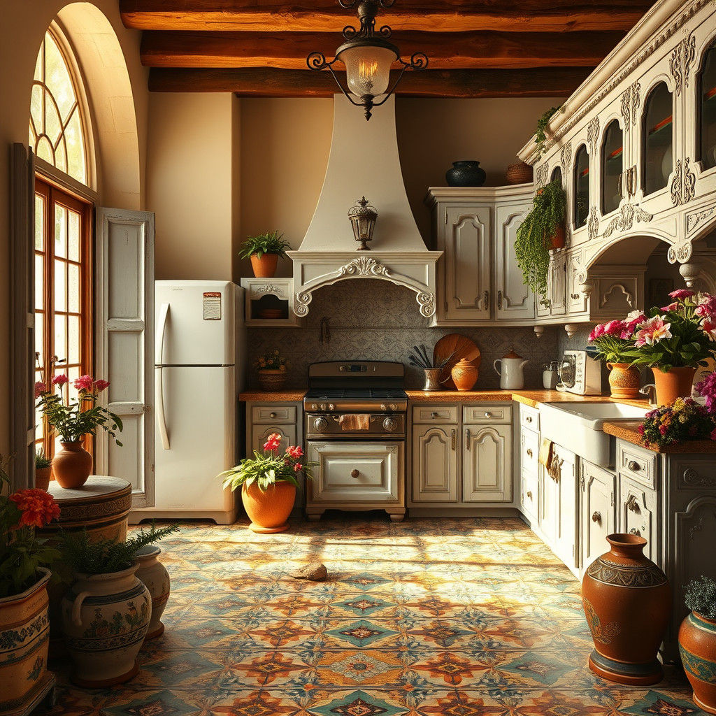 This image shows a Spanish colonial kitchen in a rustic fantasy cottage, filled with white and blue cabinets and mosaic ceramic floors. The kitchen has a warm, nostalgic ambiance with antique appliances.