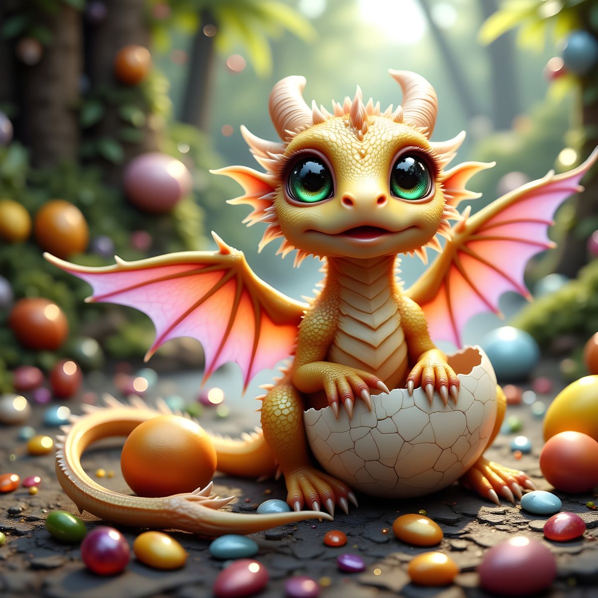 This image showcases a newborn baby dragon with delicate wings, peeking from its shell. It features a charming, whimsical digital art style with a soft, glowing atmosphere.