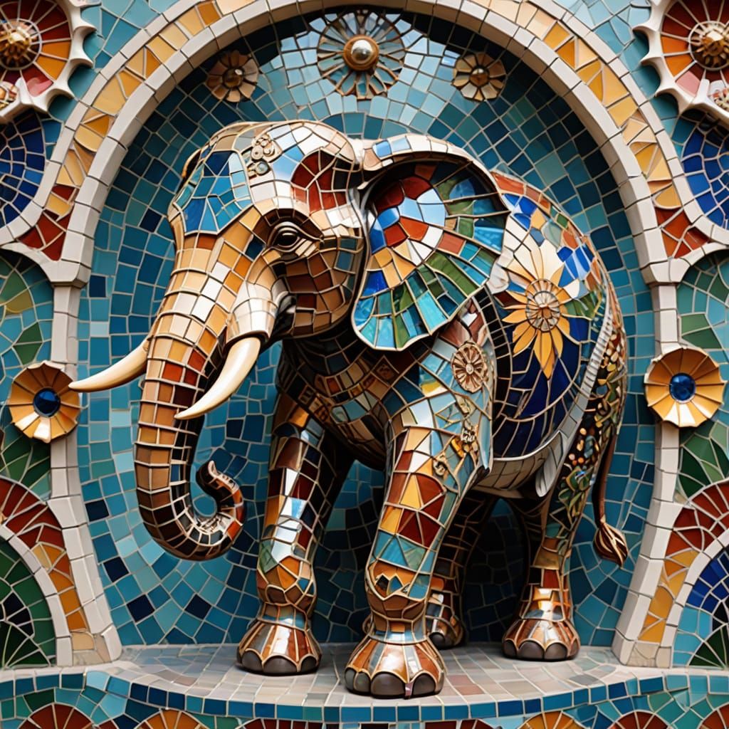 This image shows a stunning mosaic elephant sculpture in the style of Antoni Gaudí, with intricate details and vibrant, textured mosaics in a beautiful Barcelona setting.