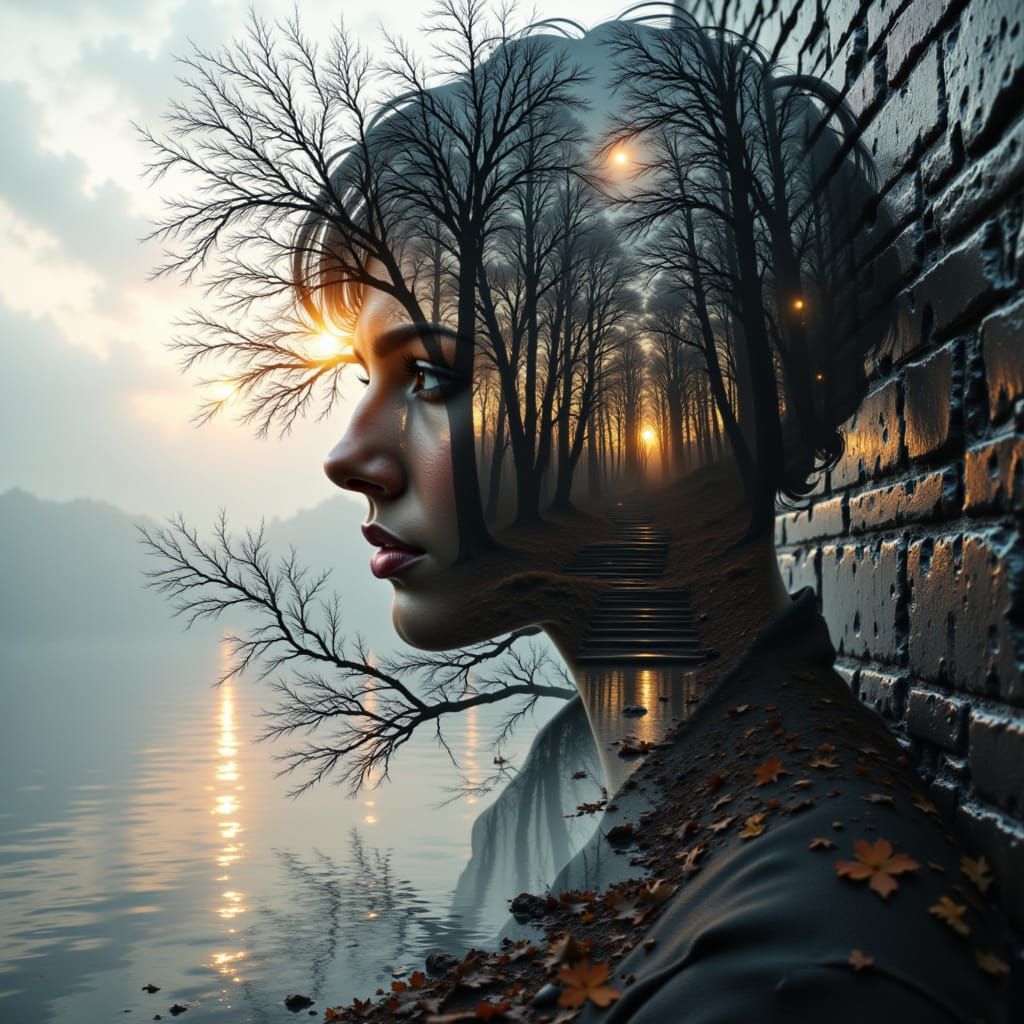 This image showcases a surreal double exposure effect, merging a silverscape and brick wall with transparent overlay. It features luminous highlights and deep shadows in an ethereal style.