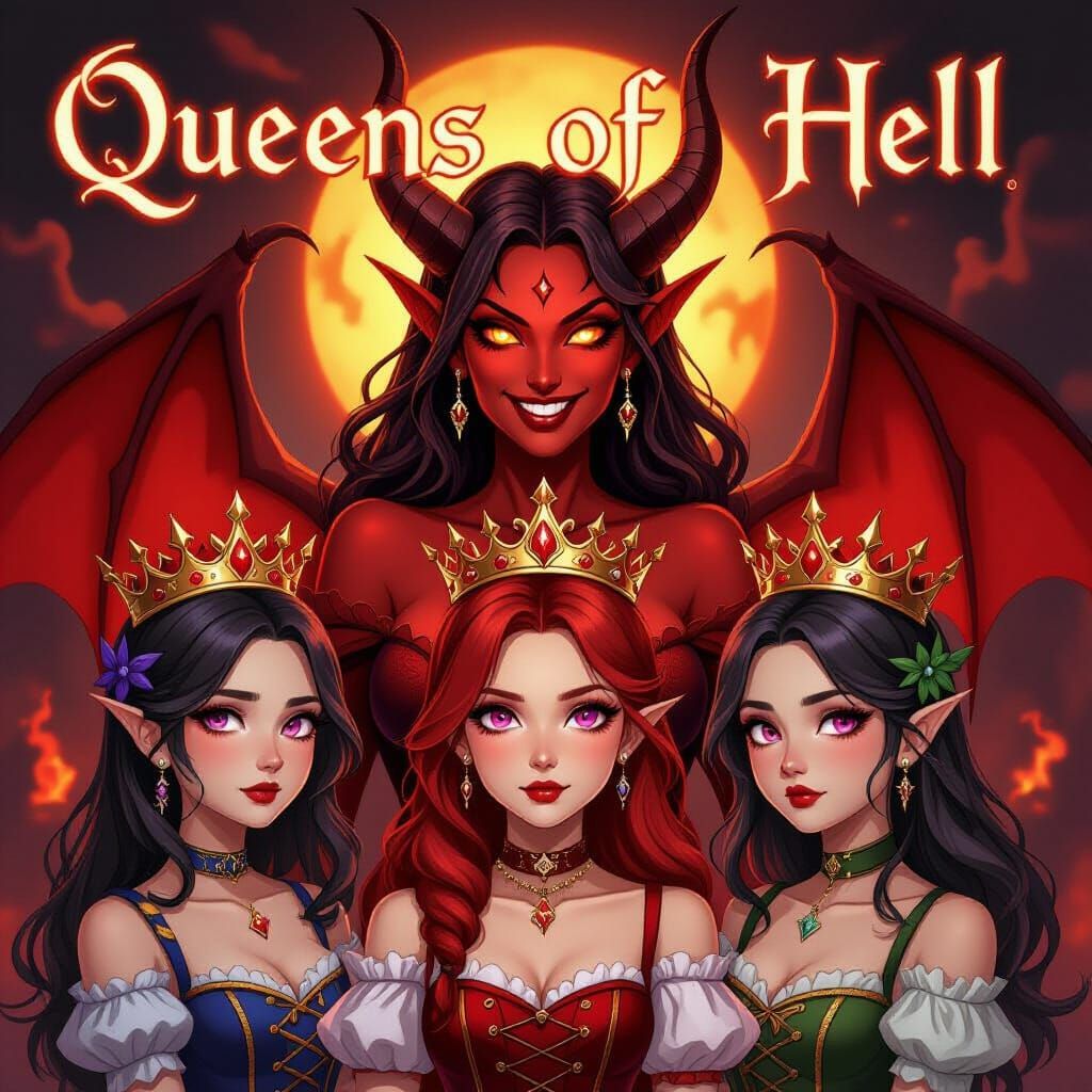 This image shows a smiling demon woman accompanied by three serious-looking girls wearing elegant outfits and terrifying crowns. Above them are the words 'Queens of Hell'.