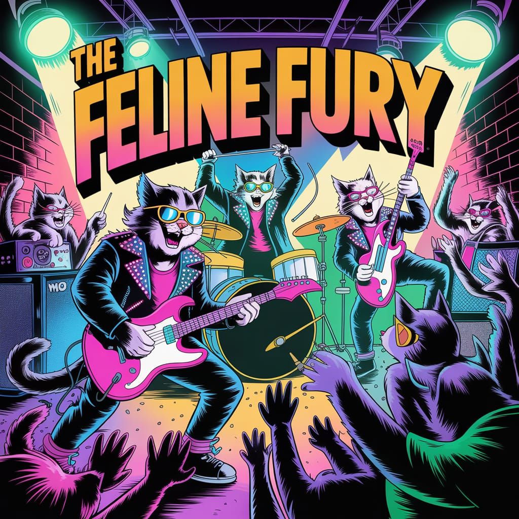 This image shows a comic book style illustration of a rock band called "The Feline Fury" made up entirely of cats. They are performing on a smoky stage in a nightclub full of cheering feline fans.