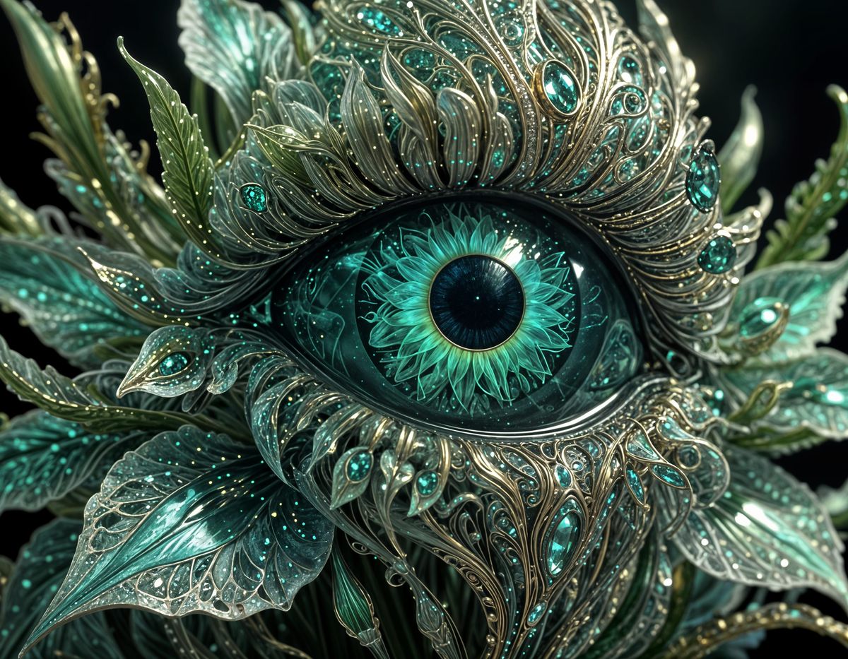 This image features a surreal and futuristic botanical fantasy with intricate, filigree-styled alien flowers that shimmer with iridescent metallic curves and glittering crystalline textures. The flowers' bioluminescent emerald eyes sparkle with intelligent alien consciousness, set against a backdrop of m...