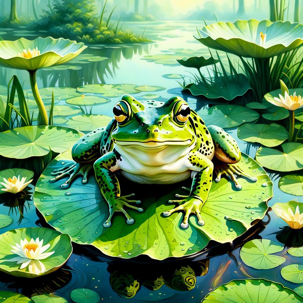 A hyperdetailed image of a large green frog sitting on a lily pad in a swamp. The artwork has a fantasy aesthetic with ethereal mist.