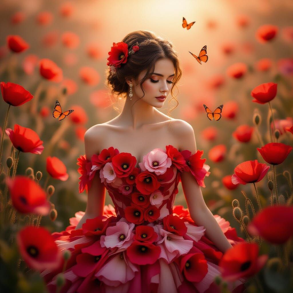 A woman embodies a living bloom, her hair and dress adorned with vibrant red petals. Bathed in soft light, she appears serene amidst a surreal floral realm with dancing butterflies. Rendered in a thick, impressionistic gouache and watercolor style.