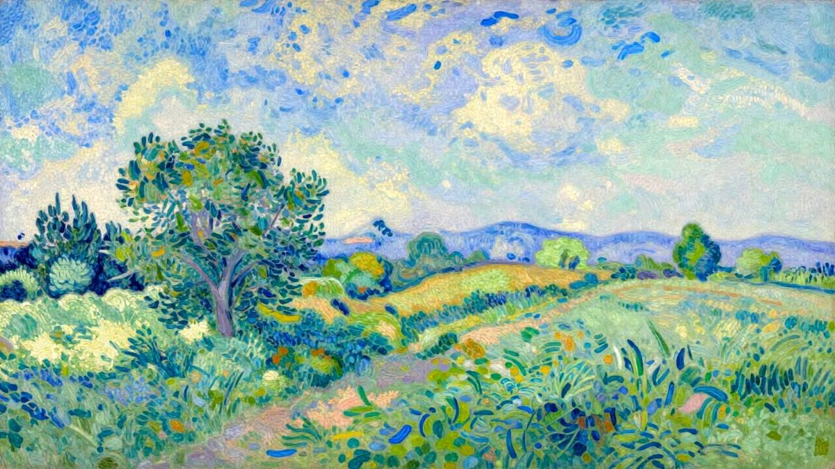 This image showcases the distinctive pointillism technique, characterized by the application of small, distinct dots of color to form an image. Explore the beauty of this artistic approach.