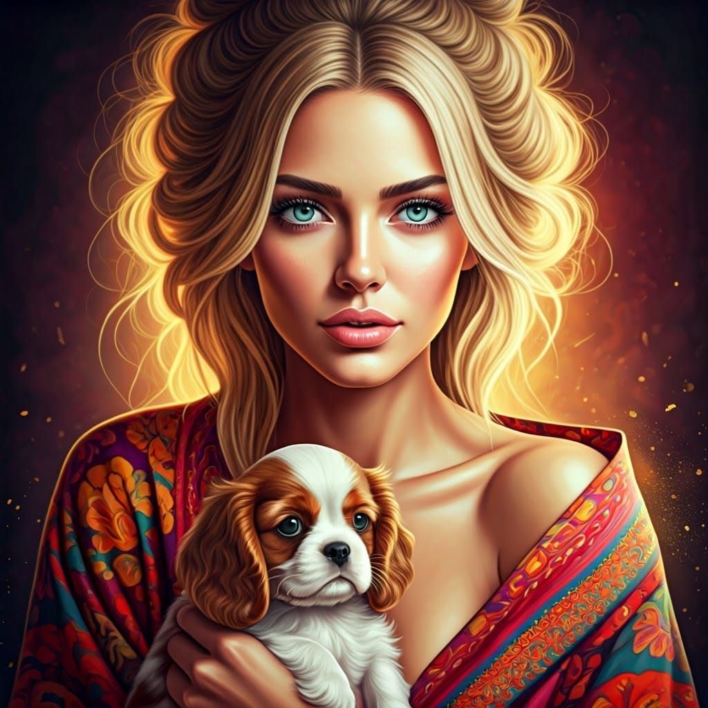 A vibrant painting of a beautiful woman with flowing blonde hair, holding a Cavalier King Charles Spaniel puppy. The artwork features a rich color palette and intricate details.