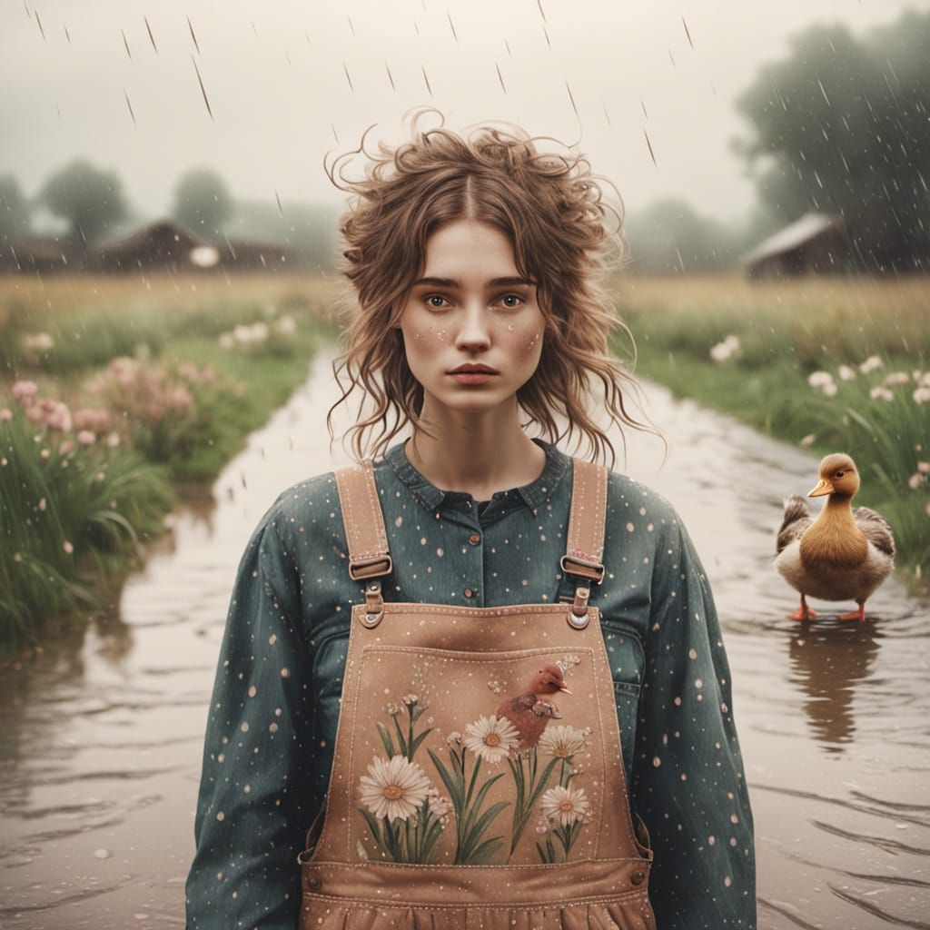 A charming illustration of a girl and her duck enjoying a rainy walk. The artwork features earthy tones, soft focus, and floral embroidery, capturing a dreamy, vintage aesthetic.