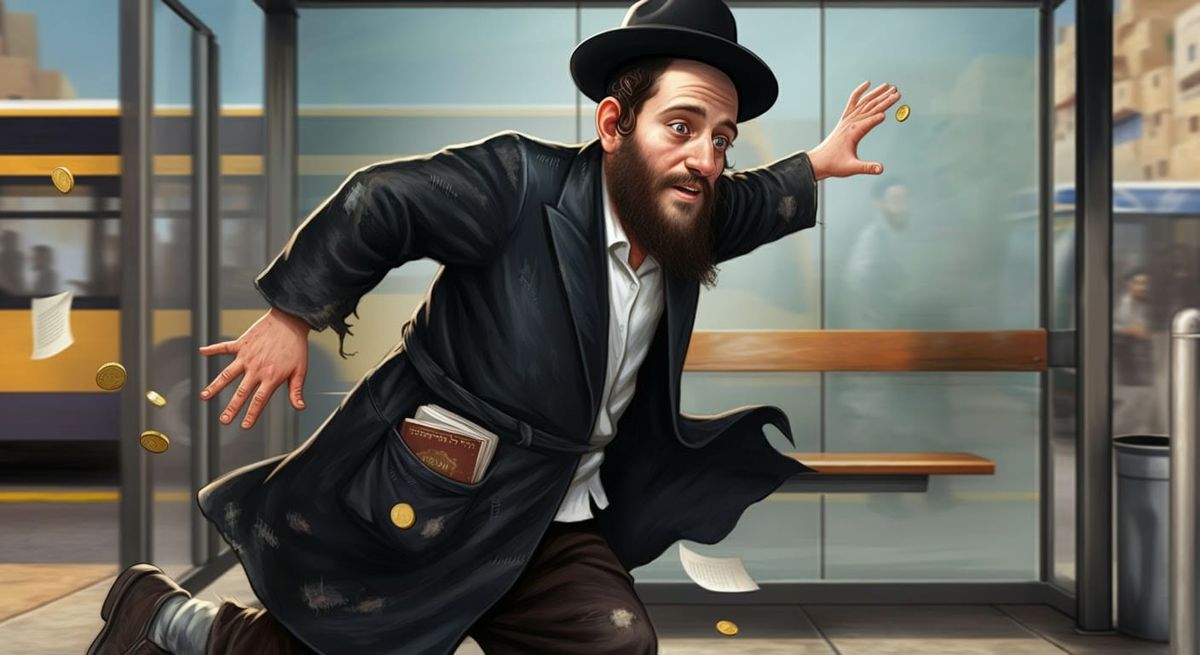 This image shows an Orthodox Jewish man running for his bus. Clad in traditional garb, he is illustrated in a realistic comic art style with attention to the details of his worn clothing.