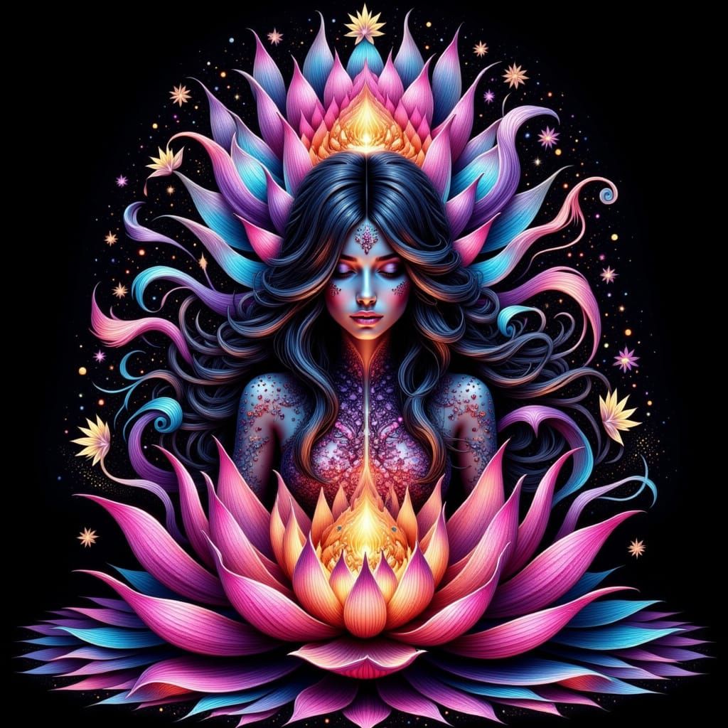 This image features a stunning, hyper-detailed goddess crafted from intricately arranged lotus flowers, set against a black velvet background, with a vibrant neon color scheme reminiscent of a black light poster.