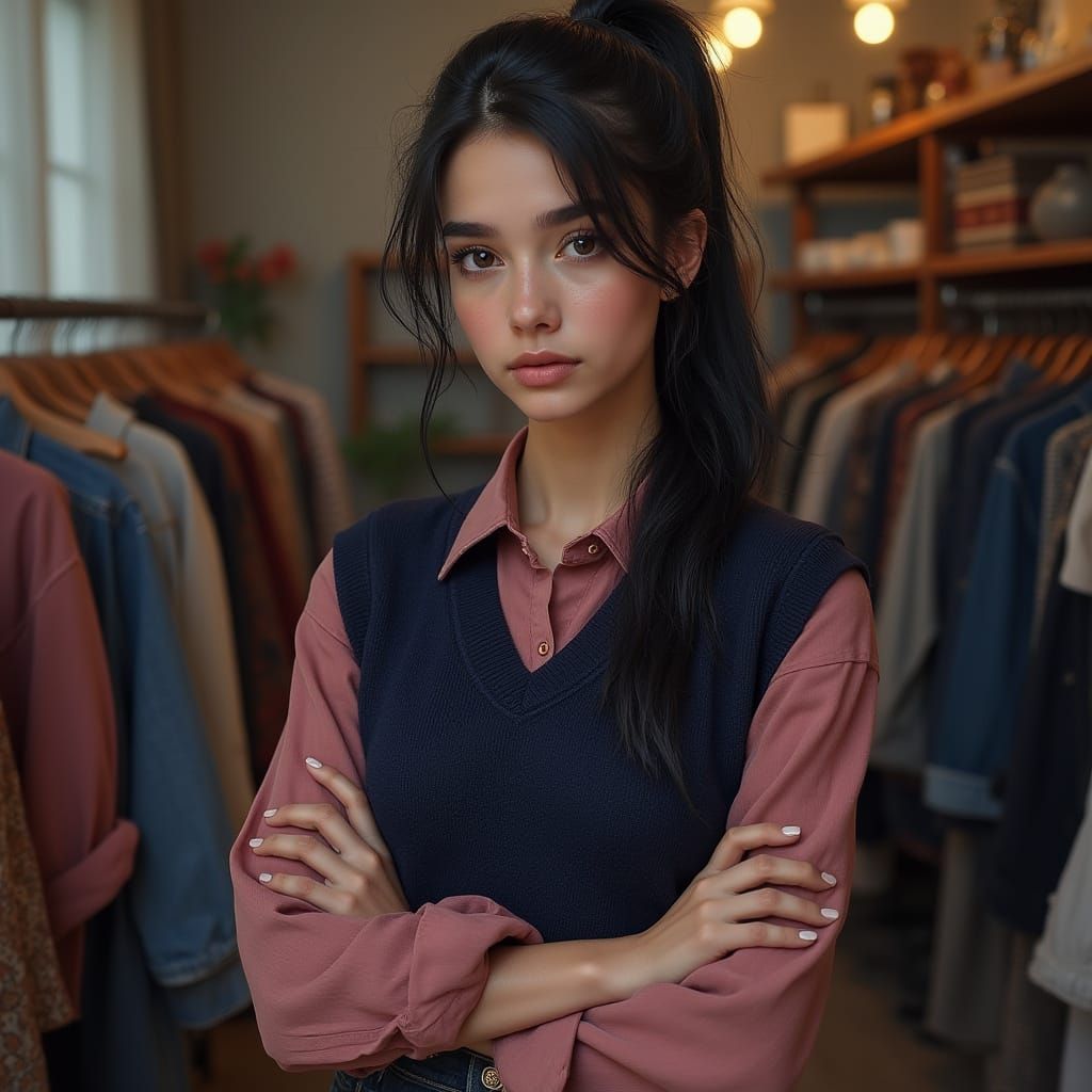 A hyperrealistic image of a young Spanish woman with dark hair in a ponytail, wearing a sweater vest and denim skirt. The image features intricate textures and subtle lighting.