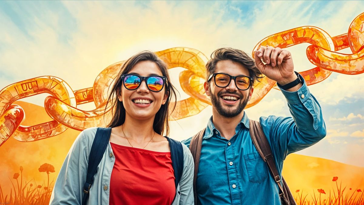 This image depicts a serene morning scene with two friends near an artificial intelligence chain, exchanging warm greetings and receiving unique gifts, rendered in a vibrant gouache style with thick brush strokes and textured layers.