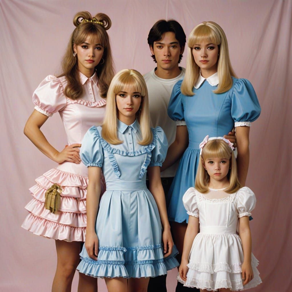 This image depicts a 19-year-old in a 1990s scene, dressed in a frilly short dress and blonde wig, posing with family in a studio photograph. The style captures the fashion of the era.