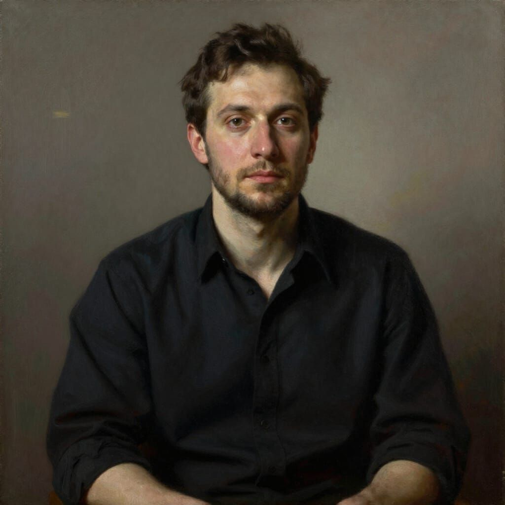 This image shows a man sitting upright with clear, serene features, wearing a dark shirt. The realistic, atmospheric style features soft chiaroscuro lighting and deep jewel tones, emphasizing his face and creating a tranquil mood.