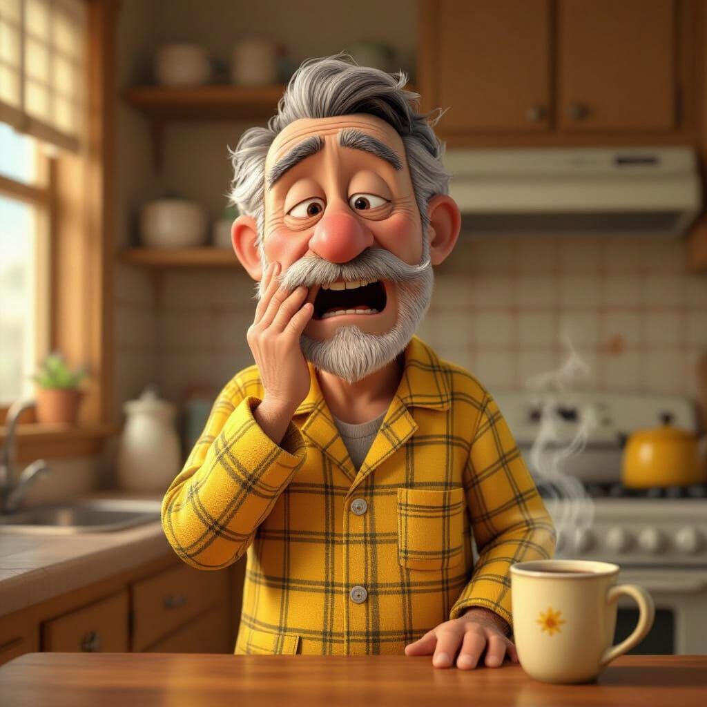 This image shows an exhausted, elderly man in pajamas yawning in a retro kitchen. The 3D rendered art features warm lighting, soft textures, and a Pixar-inspired style.