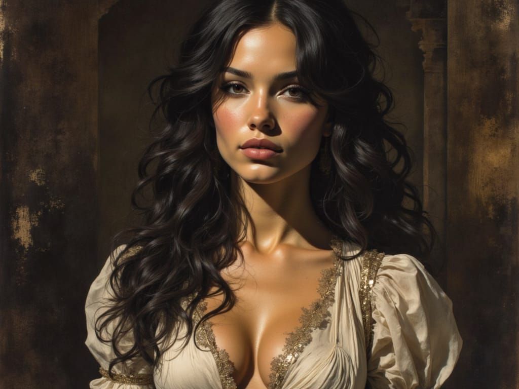 This full body portrait captures Abigail Spencer as Megan Fox in a 1590 Versailles setting. The image features bold lines, deep contrast, and dramatic lighting reminiscent of William Turner's style.