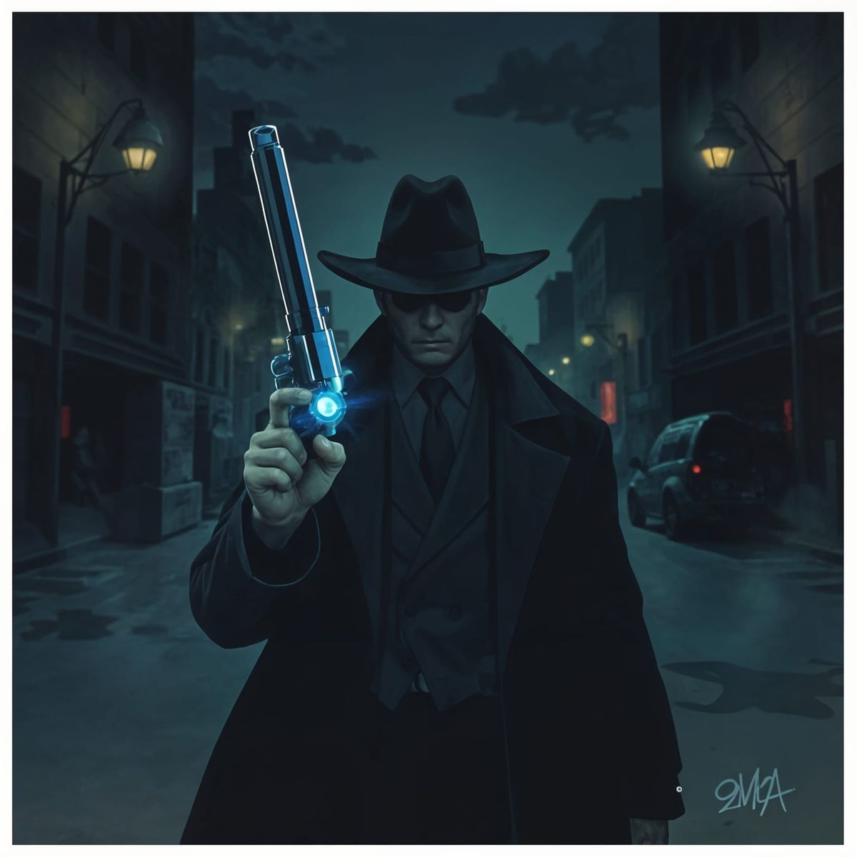 This image depicts a striking, cold-toned gun barrel. The artwork evokes themes of danger and mortality, presenting a grim and powerful visual statement.