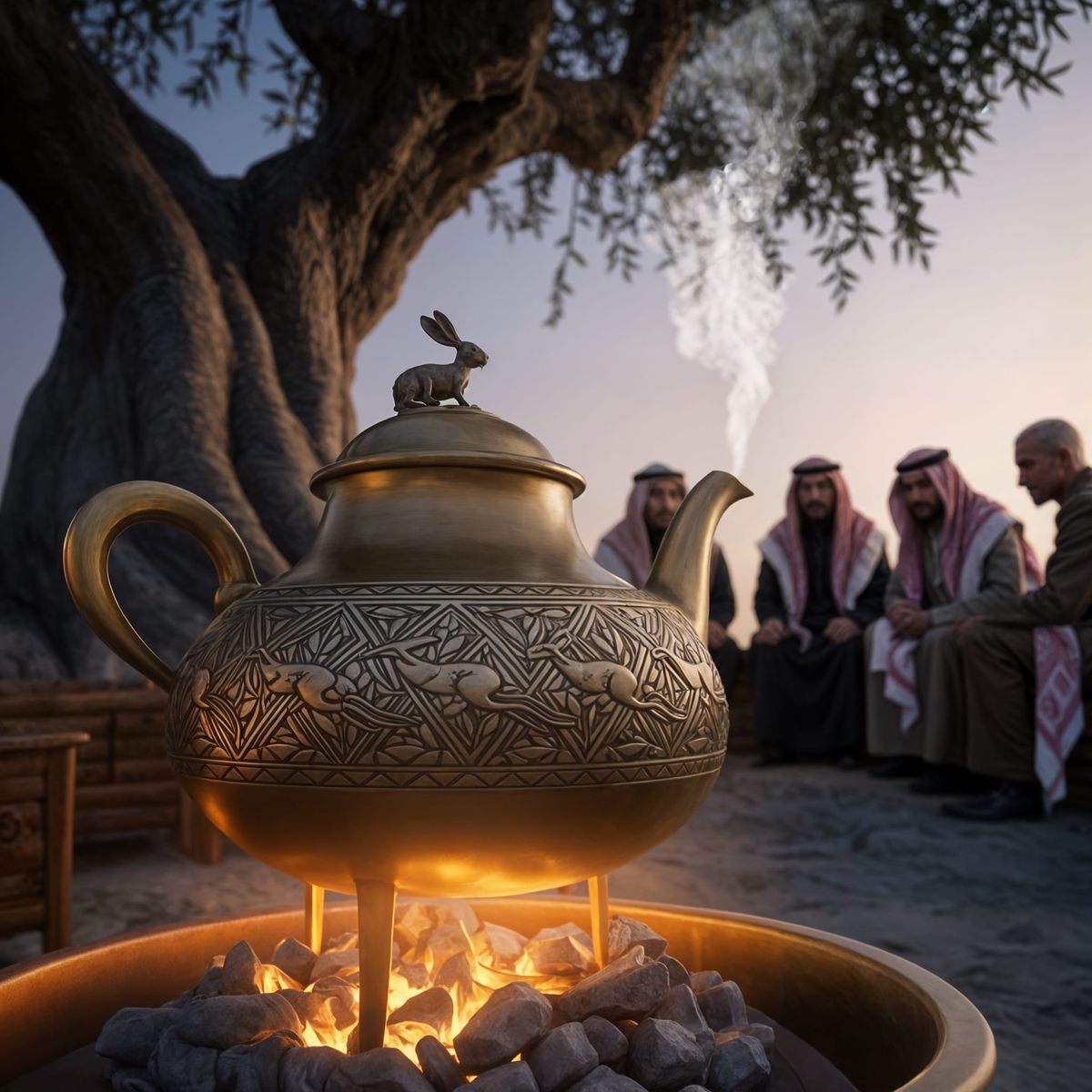 This photorealistic image captures a warm evening in a Palestinian diwan, featuring a brass teapot on a coal stove amidst elders talking. Cinematic and atmospheric.