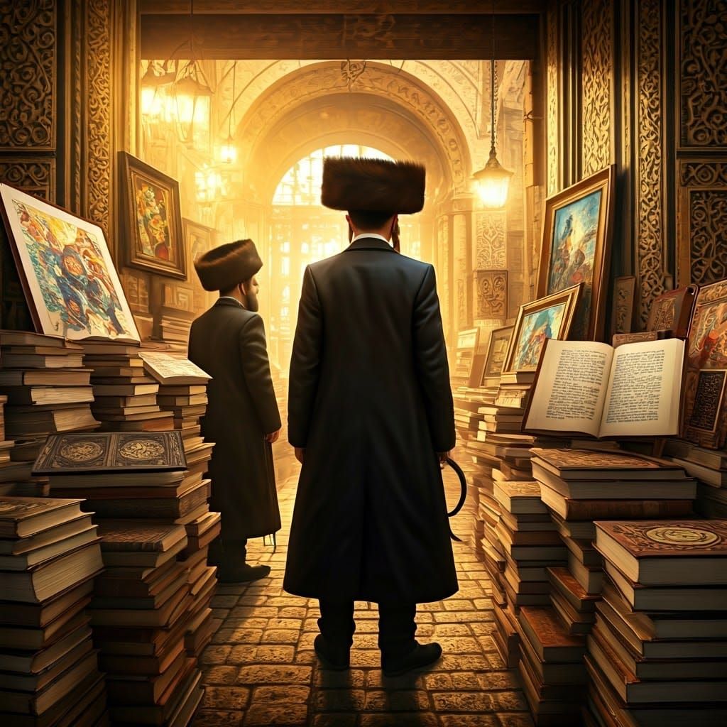 This image shows ultra-Orthodox people in a bustling marketplace filled with books and artwork. The scene is depicted with warm lighting and rich textures, reminiscent of historical paintings.