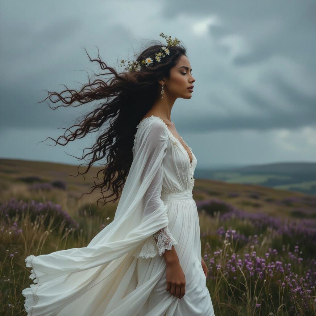 This image shows a bi-racial woman in a white gown on a moor, gazing towards a stormy sky. The scene captures a dark romanticism aesthetic with gothic undertones, reminiscent of pre-Raphaelite paintings.