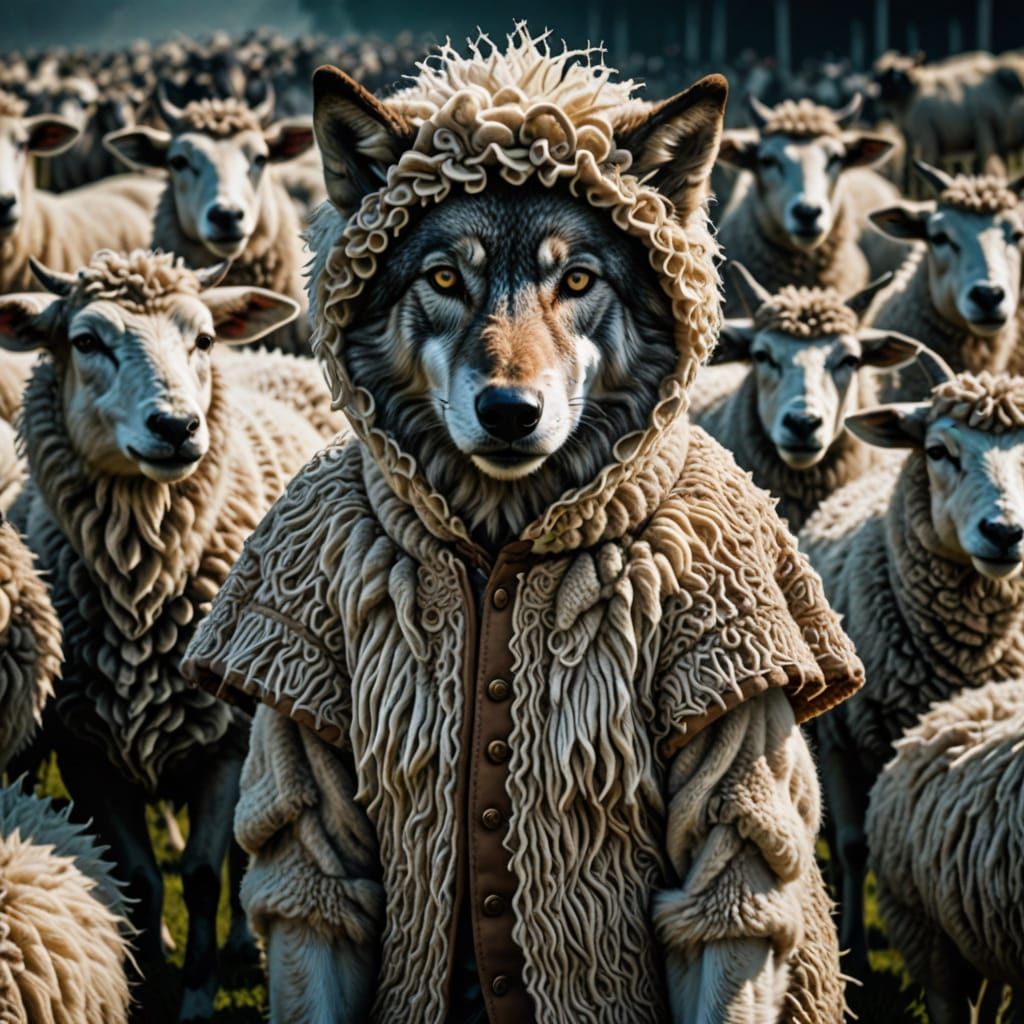 A wolf wearing a sheep costume among a flock of sheep intricate details, HDR, beautifully shot, hyperrealistic, sharp focus, 64 megapixels, perfect composition, high contrast, cinematic, atmospheric, moody