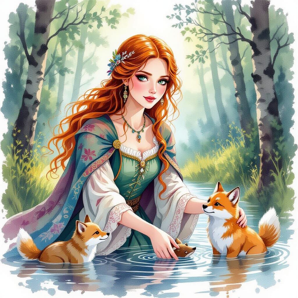 This image shows a fair woman with red hair in a Russian-style dress, aiding forest animals. Rendered in a watercolor style with alcohol ink effects, the artwork captures a scene of compassion.