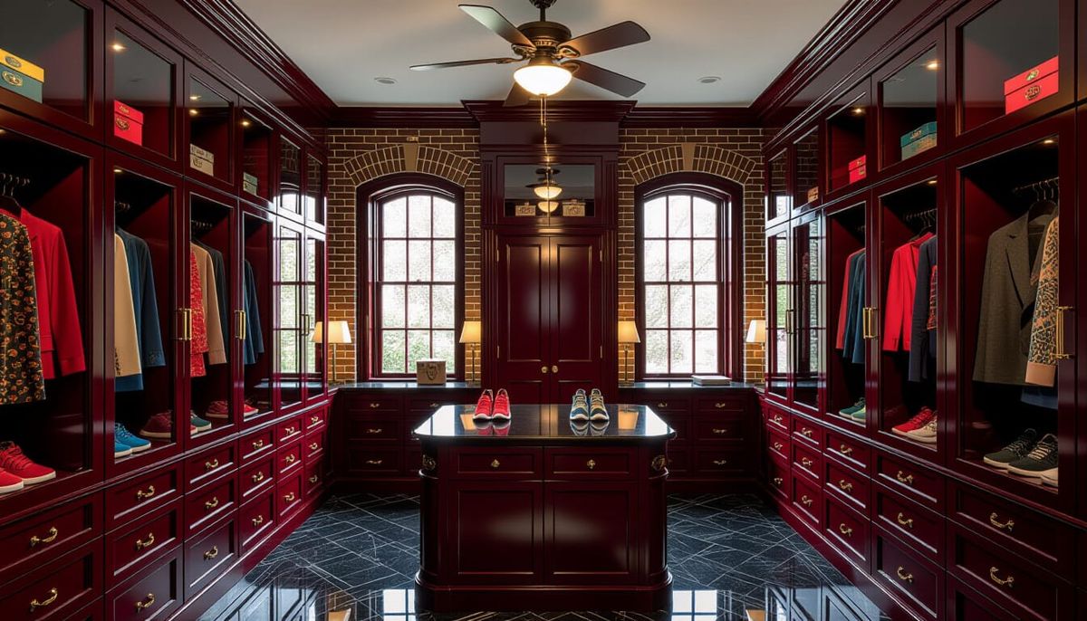 A wide-angle cinematic view of a luxurious Victorian walk-in closet. Features deep red glass cabinets, brick wallpaper, black marble floors, and a golden hour glow.