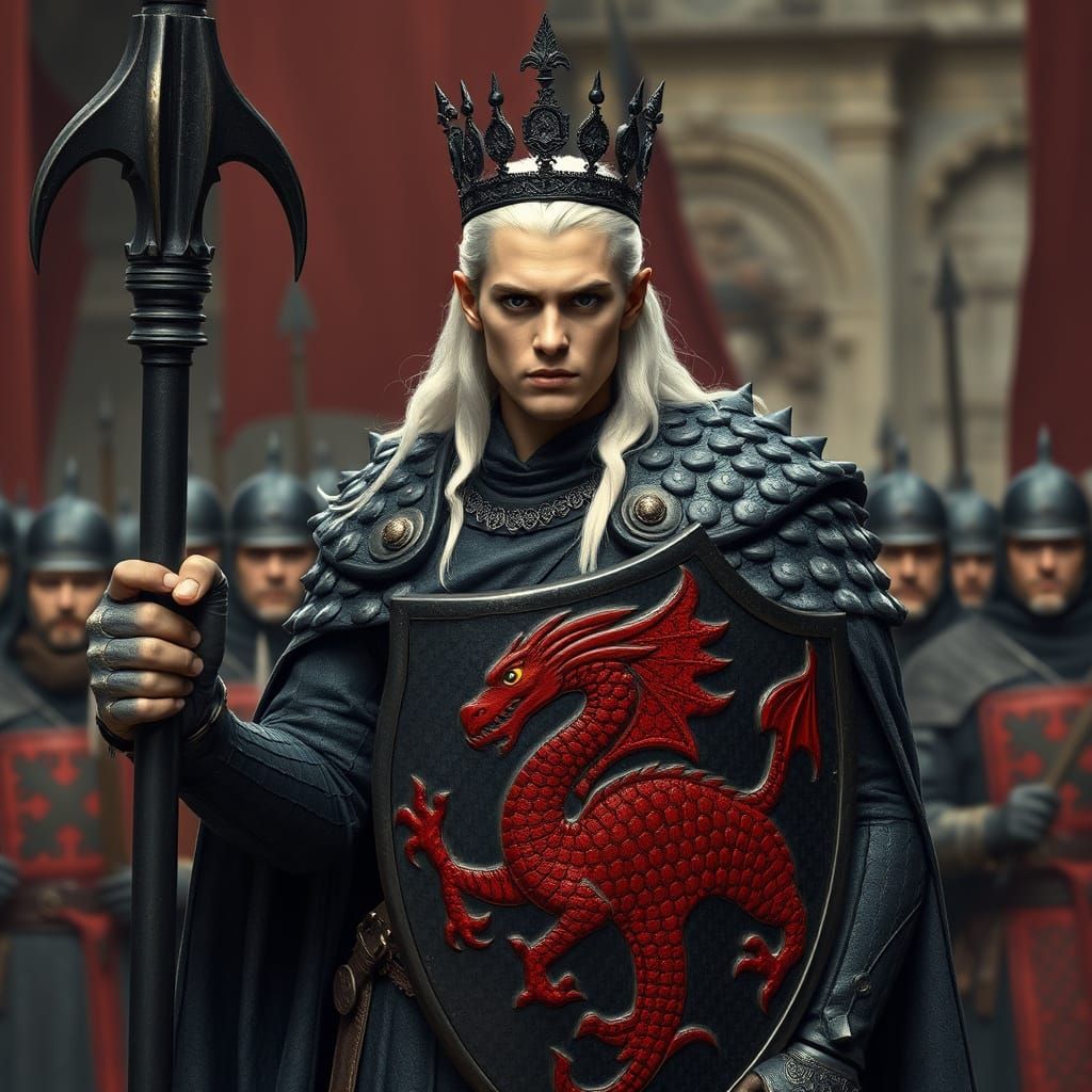 A powerful medieval queen stands tall, holding a massive black mace and wearing a black byzantine-style coat with a red three-eyed dragon on her shield, amidst a backdrop of medieval infantry