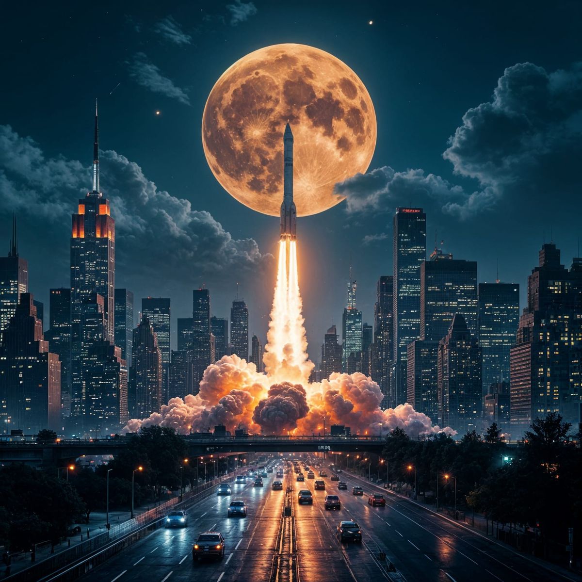 A futuristic cyberpunk city at night, inspired by New York, with towering skyscrapers and a massive rocket launching towards a red-orange moon. Features a vibrant orange exhaust plume lighting the dense urban landscape.