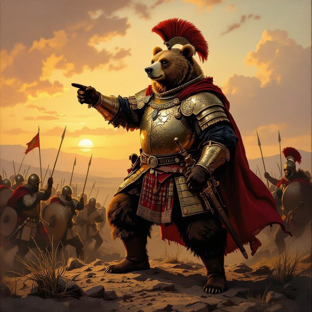 A striking picture of an anthropomorphic bear general commanding troops on a battlefield. The artwork features warm lighting and high detail in a baroque aesthetic.