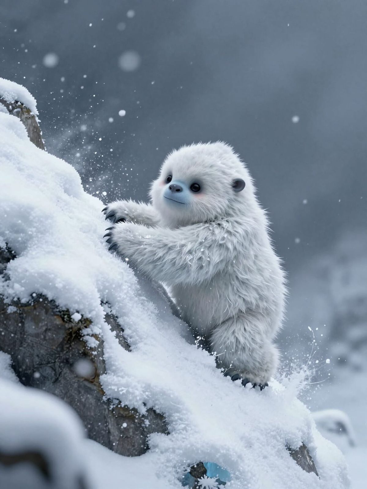 This image depicts a charming baby Yeti braving a snowstorm as it climbs a mountain. Rendered in a fantasy concept art style with rich, complementary colors.