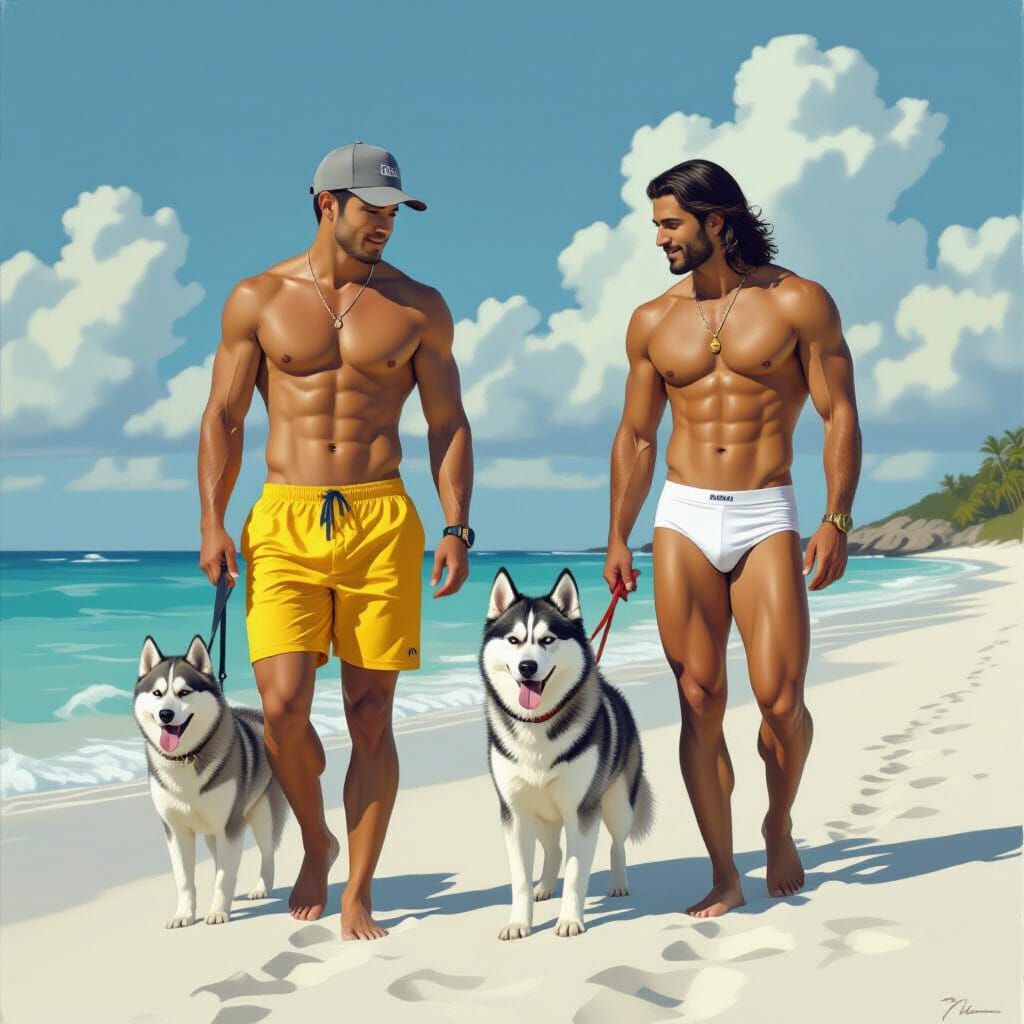 A hyperrealistic image of two handsome men on a white sand beach at early morning. One man walks a Siberian Husky, while the other admires the dog, rendered with dramatic lighting and vibrant colors.