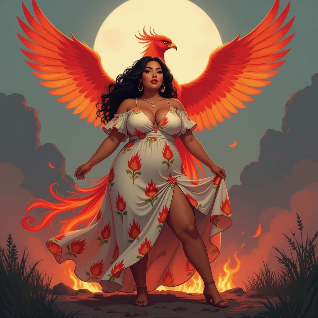 This image shows a confident Dominican woman in a fiery sundress, with a phoenix rising behind her. The art is a vibrant, fantastical style.