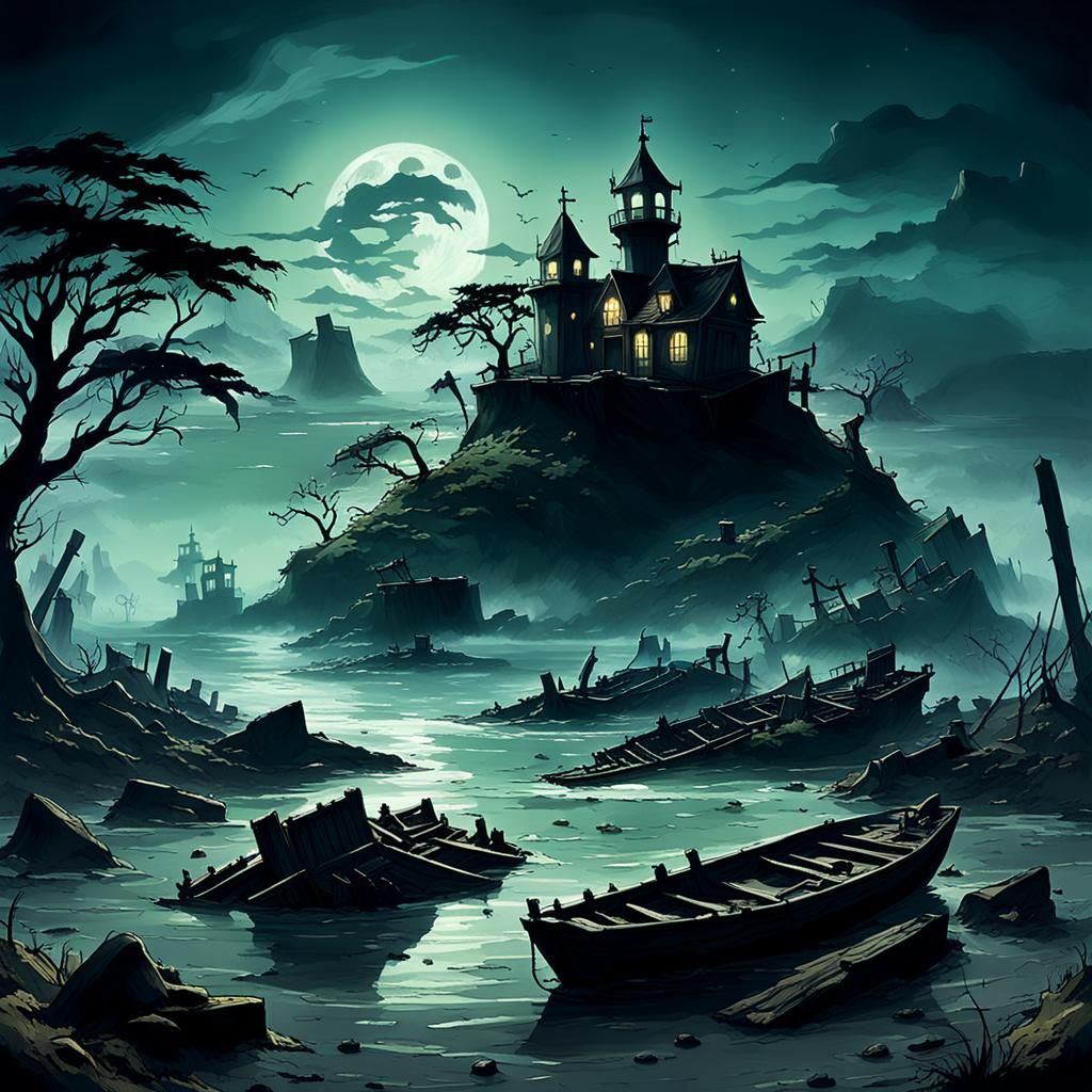 This image shows a zombie-infested island shrouded in fog, with decaying graves and shipwrecks under an eerie moonlight. The scene is rendered as bright, cinematic 3D digital art.