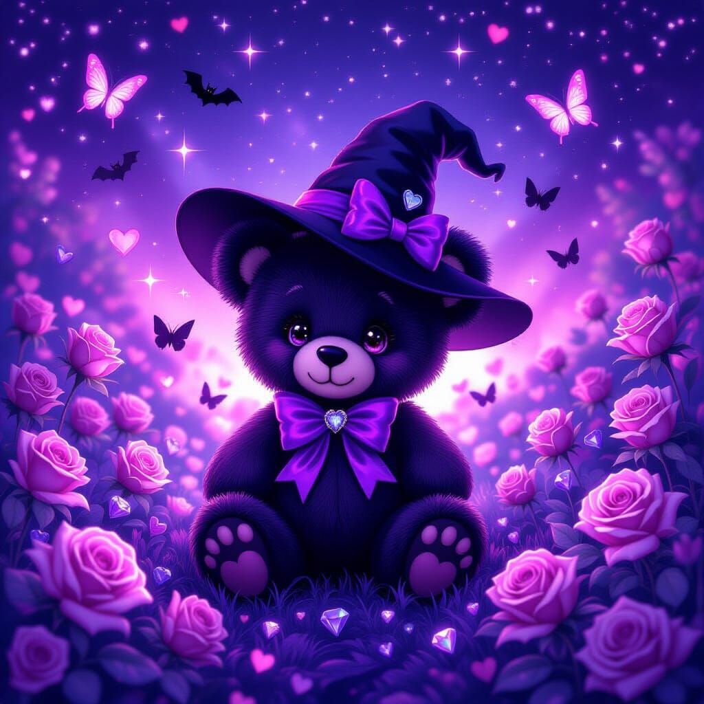 This image shows a cute black teddy bear witch in a magical garden filled with glowing purple roses, gemstones, and whimsical elements under a starry night sky. A fantasy kawaii illustration with vibrant neon details.