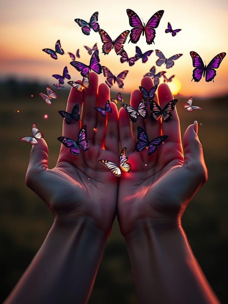 A close-up, low-angle photograph captures delicate hands releasing numerous realistic butterflies against a soft twilight sky. Hieroglyphs trail the insects, symbolizing release and hope.