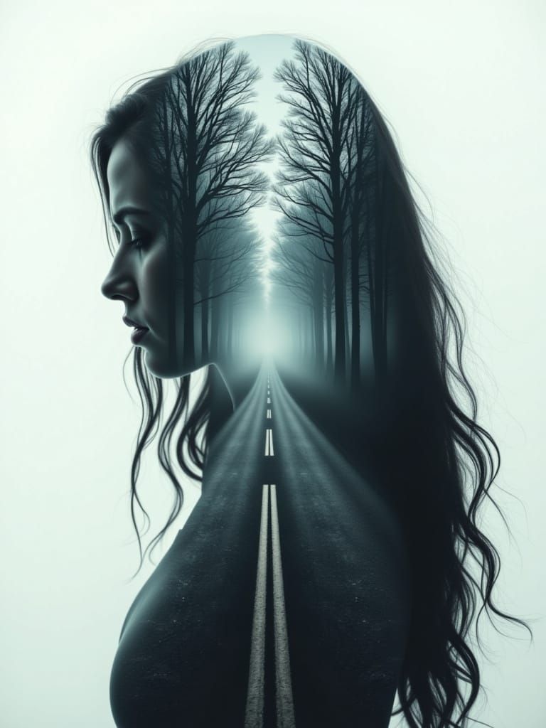 This image shows a woman in double exposure, her hair flowing as she contemplates. Silhouetted within her is a misty fork in the road, evoking internal conflict and future possibilities.