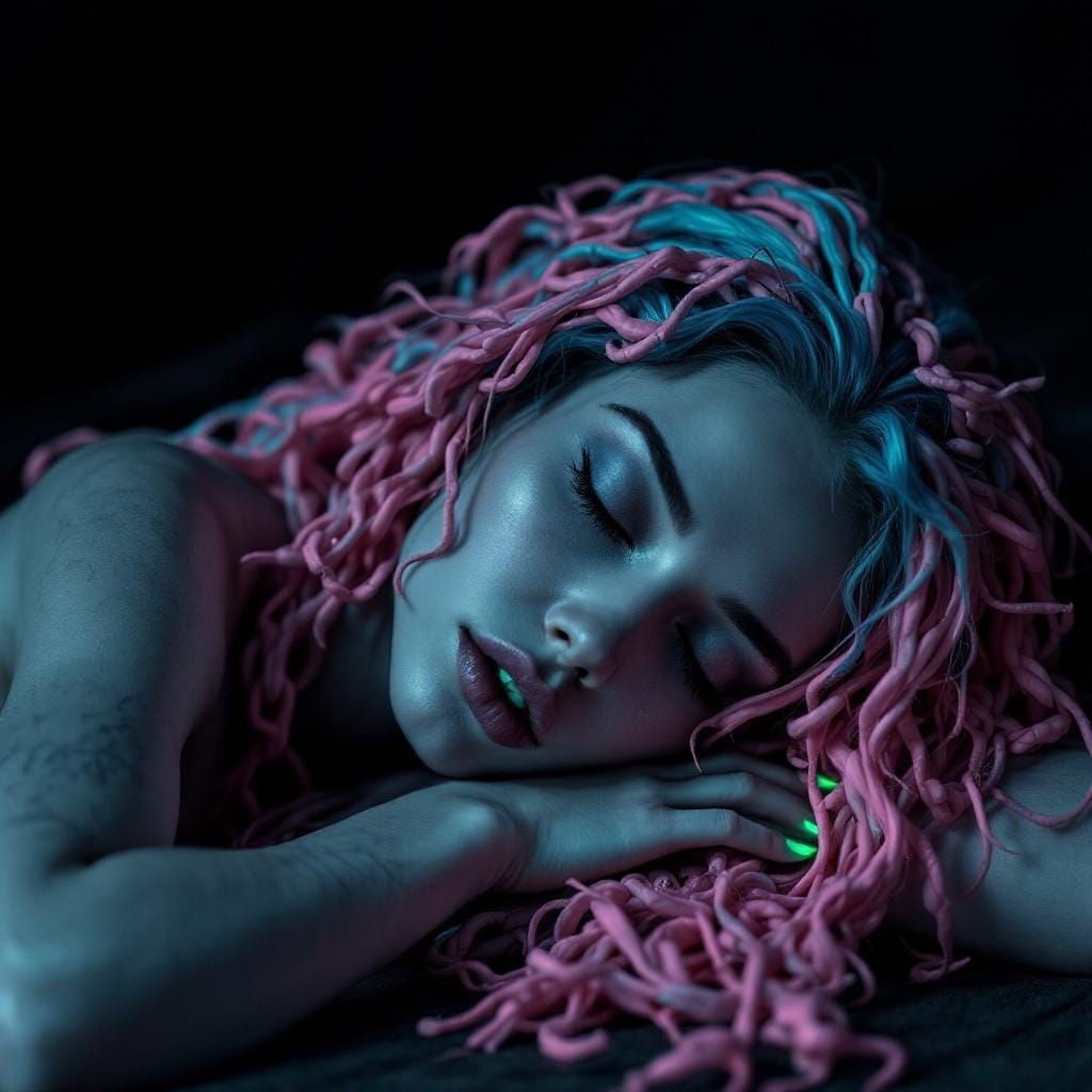 A striking picture of a Nordic woman with neon cyan and pink hair resting in shadows. Her grayscale skin accentuates her features, with eerie green glowing fingernails, rendered as matte painting with cinematic lighting.