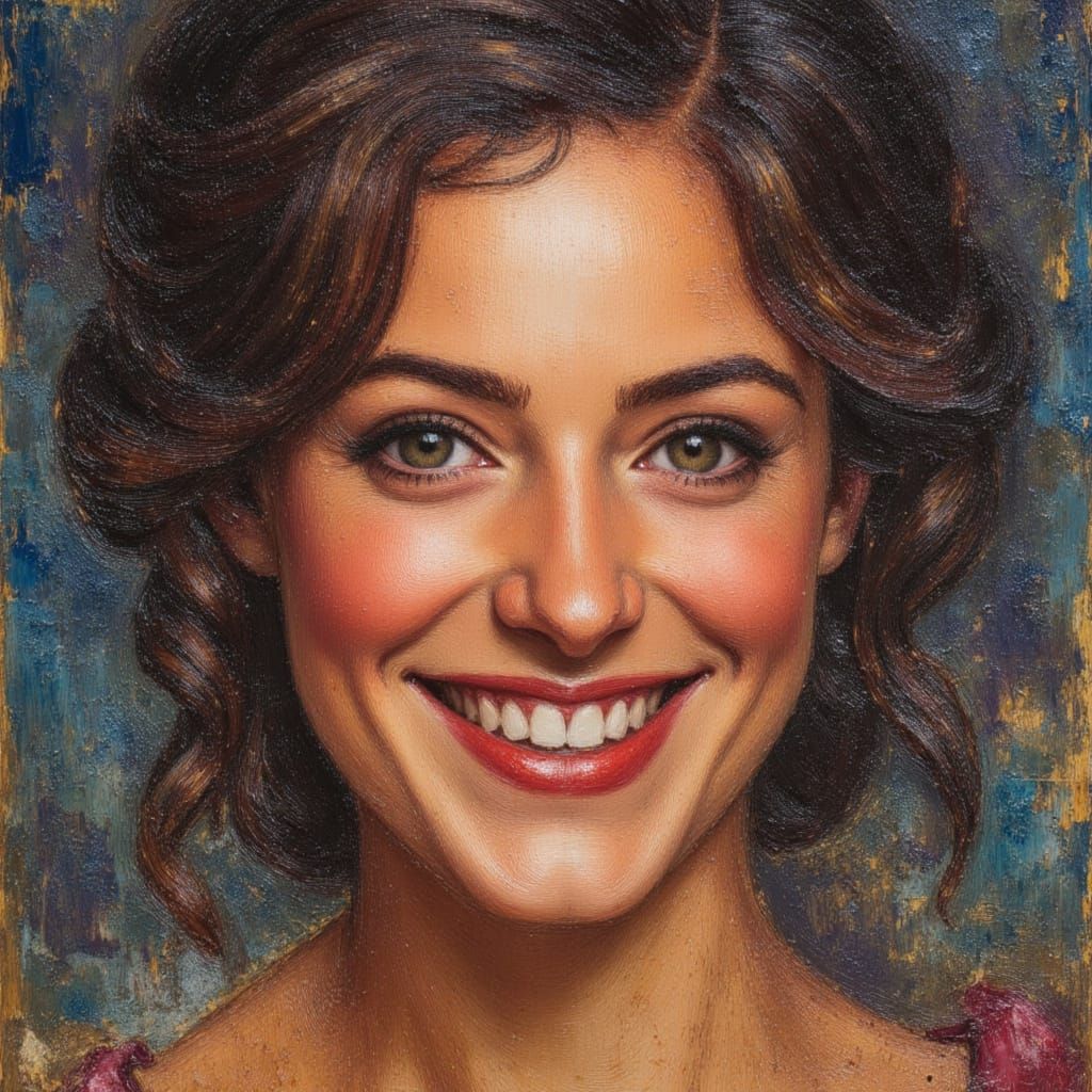 A portrait of a smiling woman in the style of Caravaggio. The painting features bright eyes, dramatic lighting, and summer colors, rendered with visible brush strokes and heavy impasto.