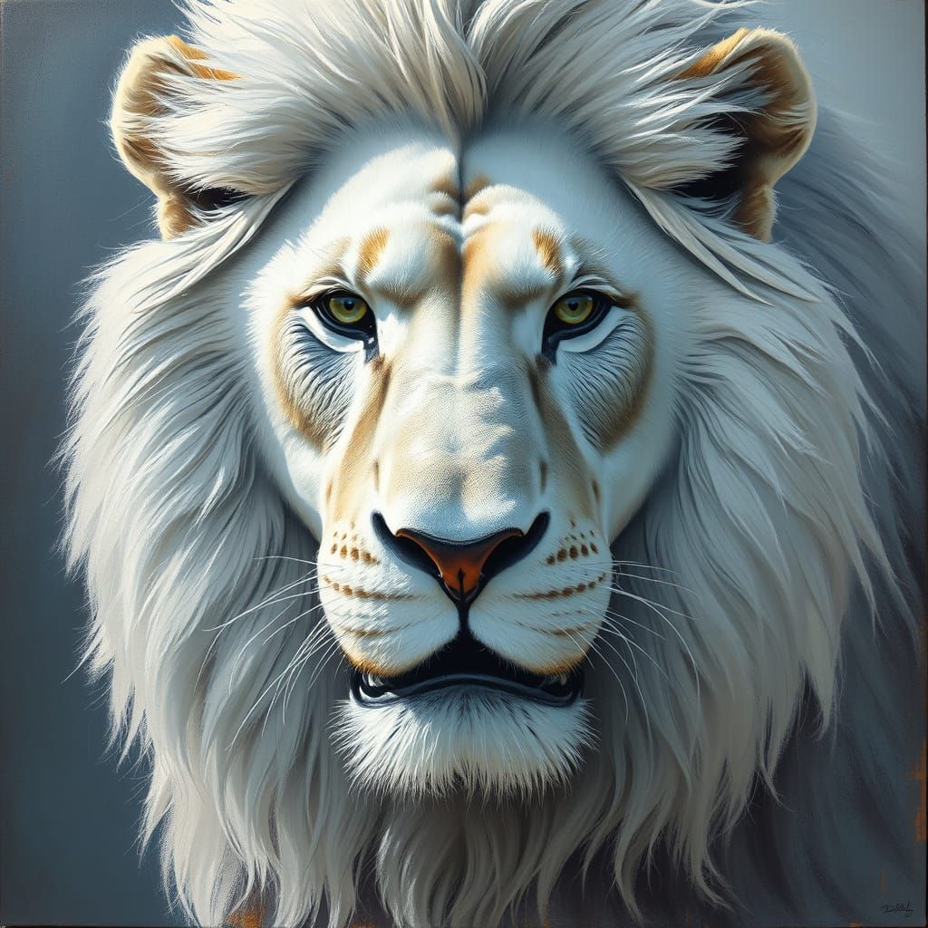 This image showcases a majestic white lion in a maximalist, impressionist style, featuring thick brush strokes, textured canvas, and cinematic lighting, blending deep colors with cel-shaded effects.