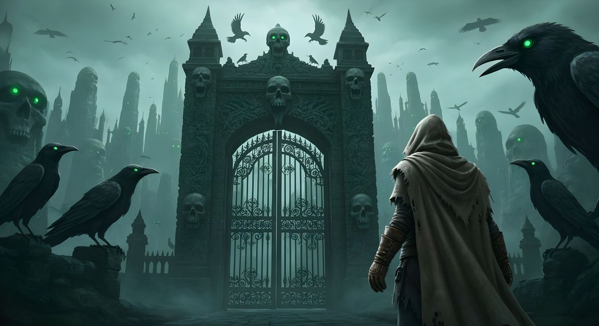 A dark fantasy image of a cloaked figure before a skull city gate. Spectral ravens with glowing eyes guard the entrance, rendered with dramatic lighting and intricate details.